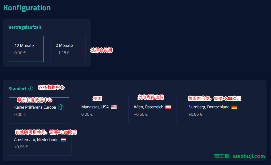 NetCup有德国纽伦堡、奥地利维也纳、荷兰阿姆斯特丹、美国马纳萨斯等四个数据中心可选,不同地区价格不一样,其中美国马纳萨斯价格最便宜。欧洲几大数据中心如果不指定的话,也不需要额外付费。如果选择欧洲地区,没有特殊需求的话,建议选择第一个选项。