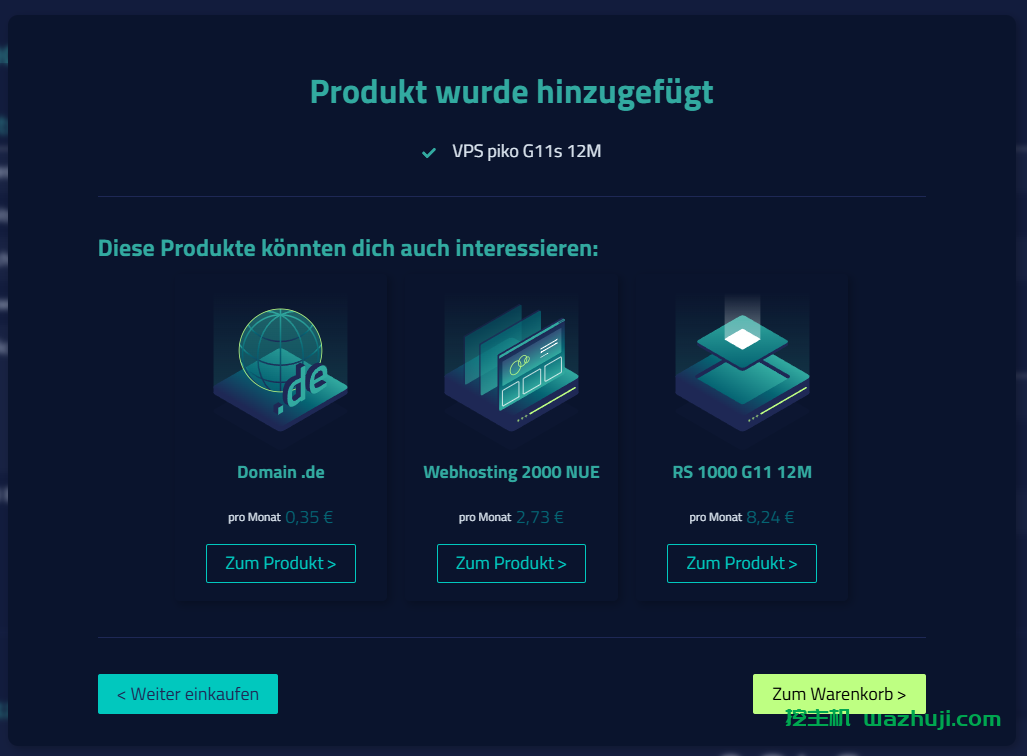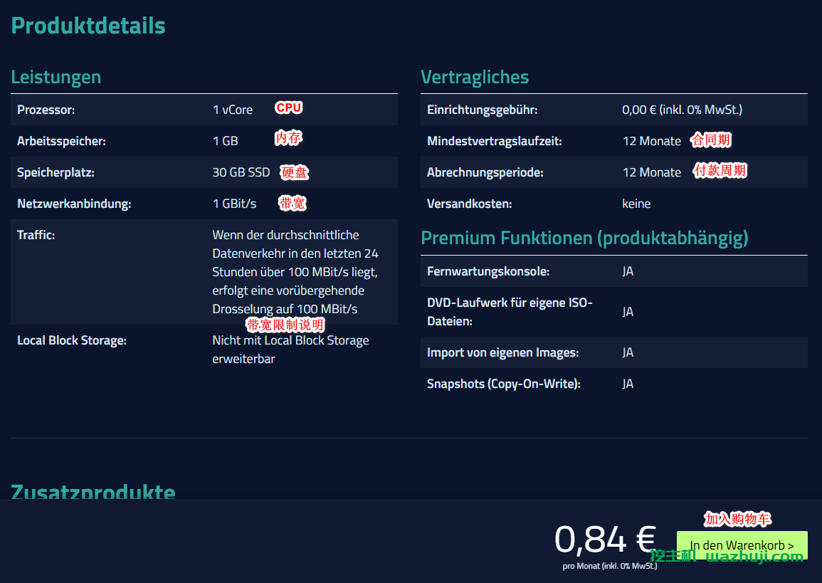 查看产品说明,包括产品的配置(CPU、内存、硬盘、带宽),以及产品的合约期和付款周期,确认无误后点击「In den Warenkorb」加入购物车。