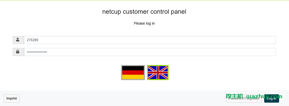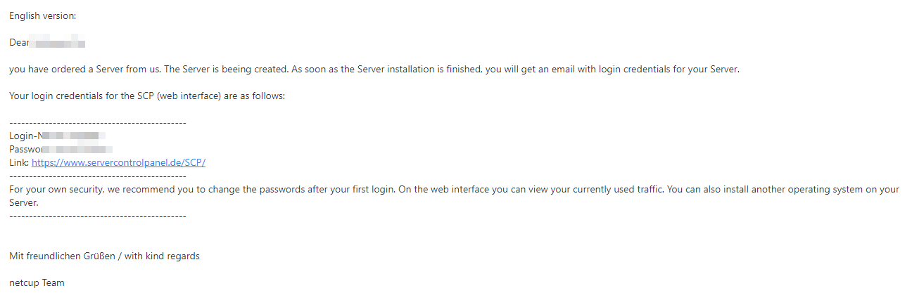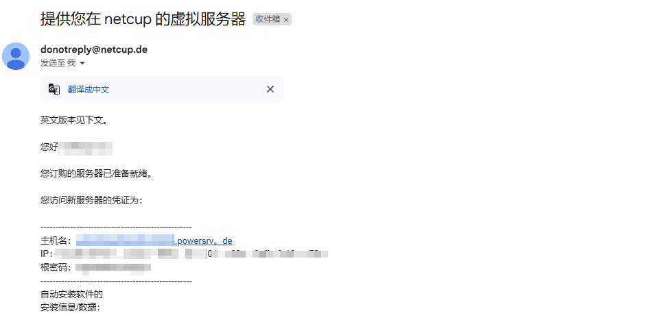 付款完成后即可收到NetCup发来的SCP面板的用户名和登录密码:
