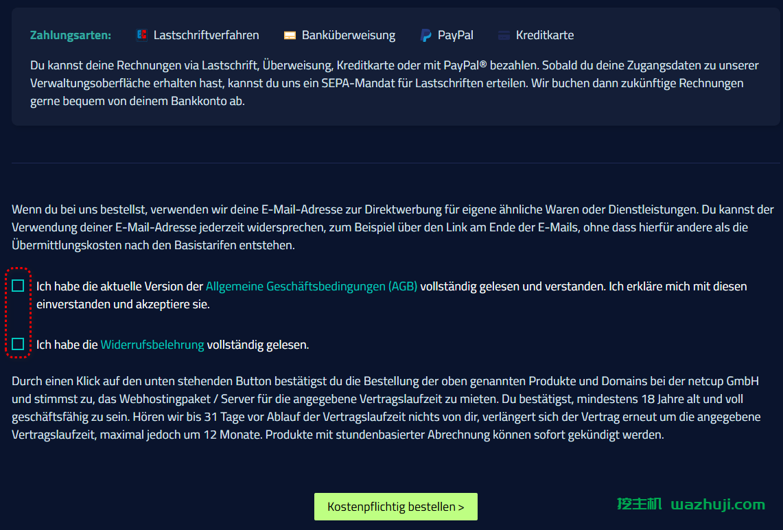 跳转到账单确认界面,这里可以看到上一步中填写的资料信息、你的订单信息、支付方式等信息,确认无误后,勾选同意服务条款和取消政策,点击「Kostenpflichtig bestellen」确认订购: