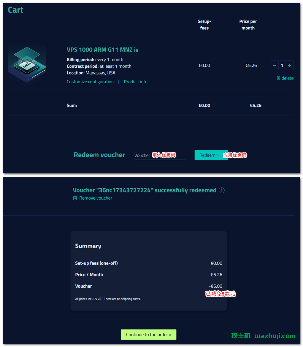 在购物车页面,可以使用优惠码。这里列出一些新用户5欧元优惠券,更多NetCup优惠券见此文。