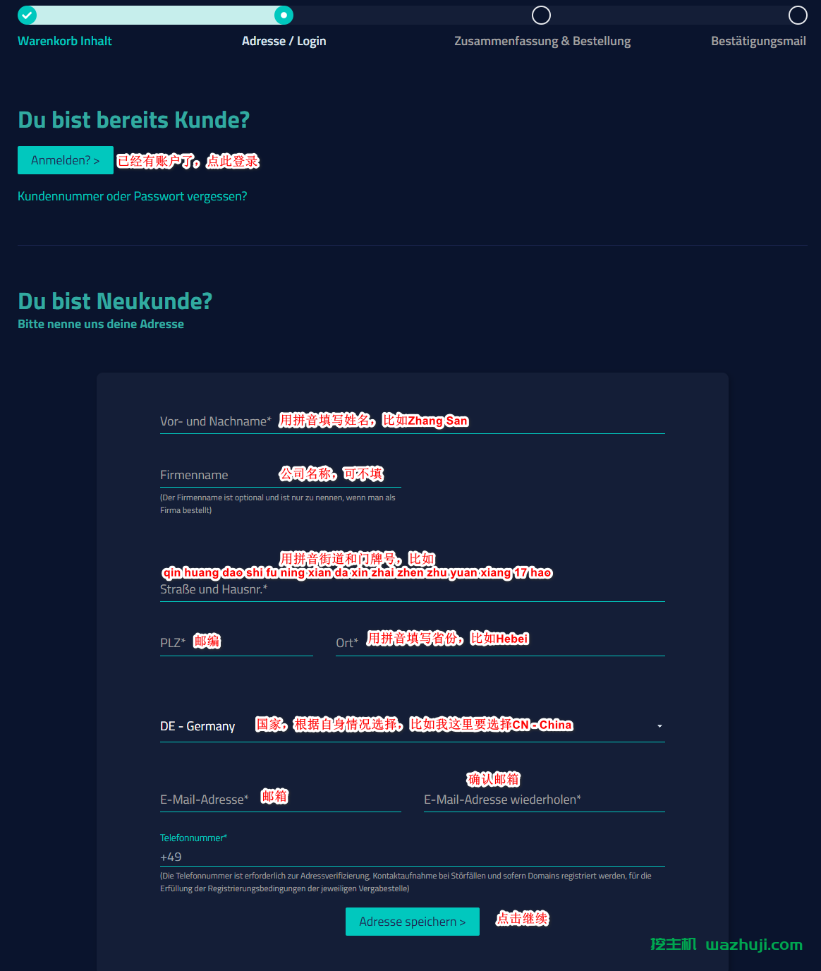 填写注册资料。注意填写资料要使用真实资料,至少要看起来是真实的,比如邮编、省份、城市等要与你的IP地址一致。电话号码格式为+8615512346789(图中忘标注了)。点击「Adresse speichern」继续: