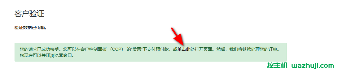 点击上图中的付款验证后,就可以去控制面板下支付预付款进行验证了。点击下图中的「单击此处」去控制面板: